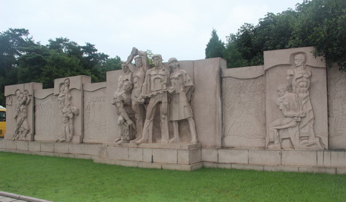 而在这之下的,就是矗立在雨花台烈士陵园园中央的烈士群雕。雨花台烈士群雕是雨花台风景区的标志建筑,建于1979年,那戴着镣铐、蔑视敌人的工人;横眉冷对的知识分子;怒目圆睁的农民;临危不惧的女干部;咬紧牙、抿着嘴的小报童;身陷囹圄、充满胜利希望的女学生;栩栩如生地再现了九位先烈在就义前英勇不屈、视死如归的光辉形象。塑像建在这里,是因为这里是北殉难处烈士就义原址,是杀害革命烈士最多的地方。在雨花台共有三处烈士殉难处,这里是北殉难处,1927年至1937年国共十年内战时期杀害的烈士集中在这里。东殉难处位于东岗坡下,是反动派解放前夕杀害共产党人和革命志士的场所;西殉难处位于中岗西侧,为烈士丛葬地,国民党反动派杀害了众多烈士,草草掩埋于此,风雨侵蚀,岁月流逝,此地曾白骨累累,被老百姓称为"髅上髅"。