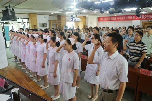 会上,院领导班子同全体新员工一道,进行了庄严而隆重的希波克拉底医生宣誓和南丁格尔护士宣誓仪式。