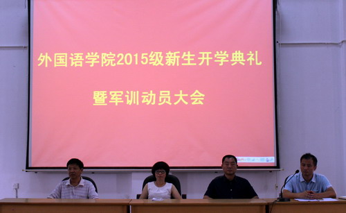 9月7日上午,外国语学院在文友楼报告厅举行2015级新生开学典礼暨军训动员大会。外国语学院院长韩琨、院党委书记杨杰、副院长柴克清、党委副书记彭晓出席了大会,学生科、团委负责人、新生辅导员、班主任及全体2015级新生参加了大会,会议由院党委副书记彭晓主持。