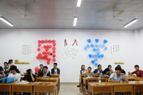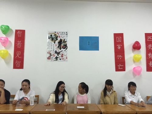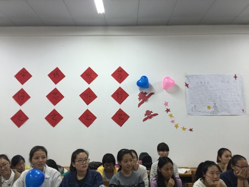 活动伊始,主持人以PPT形式给同学们观看了国学视频。紧接着,同学们的齐声诵读国学经典。一个个站姿笔挺的身影,在烛光的渲染下显得异常庄重;带着对古代文人的敬重与怀念,优雅主旋律一般的气氛让人分外陶醉。其中,《弟子规》、《道德经》、《千字文》、中国四大名著等国学大赏的演说齐出不穷;国学竞答更加成为同学们讨论的热点话题;加上五步拳的表演,简直将活动推向了一个高潮。现场的文字气息非常浓厚,甲骨文词句、水墨画、映着传统文化的简洁黑白画扇……都让人神往不已。墙纸上的“今日时钟”与“明日宣言”也同样提醒着同学们对待国学传承的诺言。伴着诸多“艺术品”的一一展现,活动也接近了尾声。