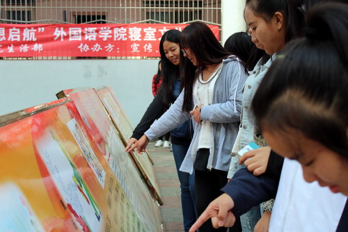 11月2日中午,外国语学院2015年“寝室文化节”于9栋学生宿舍区正式启动,此次活动由外国语学院生活部主办,宣传部与自律部协办,团学联主要学生干部及大一各班寝室长参加了此次活动。