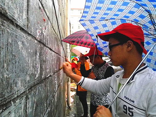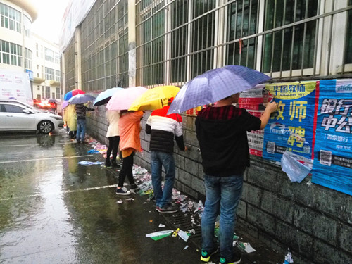 活动中,大家分成几个小组,对广场周围及食堂墙面的小广告进行清理。大家分工明确、行动迅速,个个干劲十足,带着一份热情、一份责任,手拿铲刀、抹布等工具,不怕脏,不怕累,认真清除张贴在墙壁上、公告栏上的小广告,用实际行动为美化九院贡献了力量。一张张灿烂的笑容,一把把可爱的雨伞,诚心服务的他们是校园一道亮丽的风景。