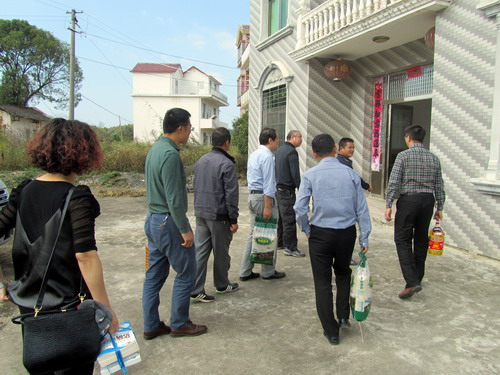 在武宁县官莲乡东山村支书的引领下,会计学院党政领导一行不辞辛劳,径直来到结对帮扶贫困户朱胜华的家中,不仅送上了大米、食用油、慰问金等物质食粮,而且还送上了农作物种植技术、家禽养殖书籍等精神食粮。