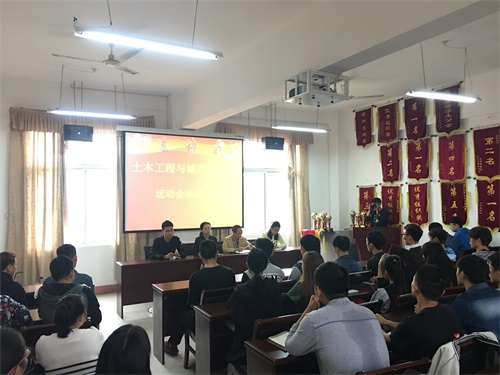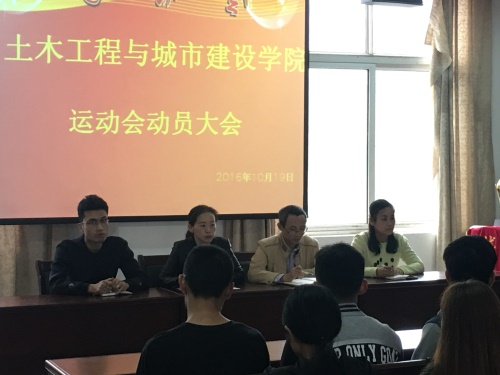 为迎接一年一度的校运会,10月19号下午,土建学院于望庐楼党员活动室召开第十五届校运会动员大会。学院党委副书记项忠平,团委书记任丹阳、副书记谢彬,辅导员李斌出席会议,田径队全体队员参加会议。会议由谢彬主持。