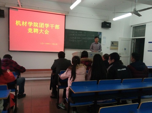 11月9日下午,机材学院于竞知楼309教室举行团学联学生干部竞聘大会。机材学院党委副书记陈娜、团委书记彭西峰、学生科副科长李新萍、团委副书记欧阳效卓、学生科老师李悦以及团学联部分学生干部担任了本次竞聘大会的评委。机材学院竞聘团学联学生干部的64名同学参加了本次大会。