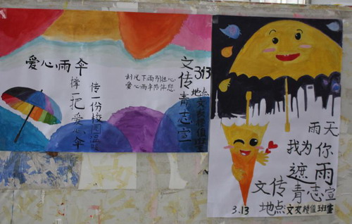 正逢雨季,为让文传师生在突发性降雨天能够顺利出行,文传学院青年志愿者于3月开始准备“撑一把爱心伞,传一份校园温暖”为主题的爱心雨伞活动,活动于3月13日中午在文友楼团学联值班室正式开始。爱心伞海报被张贴在文友楼大厅,爱心雨伞被悉心安置。
