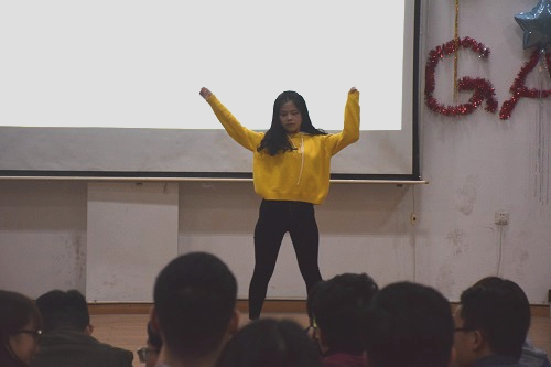 3月29日下午,同学们早早地来到文友楼三楼报告厅进行紧密地排练,并对会场进行了精心地布置。当男女主持人上场宣布晚会的开始,三位女生带来的一首《勇气》揭开了晚会的序幕。接下来是一首古风古韵的《凉凉》,青黄古风裙在舞台上翩翩起舞,深情对唱引人入境。而四组的集体合唱《同桌的你》温馨而又浪漫,整齐的球服带着亮丽青春的色彩。别样的南北方«新闻联播»给人带来全新的感受,混搭的«江南饮酒醉»更是把全场气氛推至了高潮,激情澎湃的朗诵«中国人,不跪的人»激起了观众的强烈爱国之情。小品«小明说事»以浓浓的东北腔令人回忆起白云黑土的幽默经典。接下来,骨干班全体带来的舞蹈串烧以及歌曲串烧其中穿插着浪漫的歌剧«罗密欧与朱丽叶»。压轴节目«不说再见»完整地再现了骨干班这些天的点点滴滴,纸飞机飞向舞台,班长上台致辞为本次晚会画上圆满的句号。