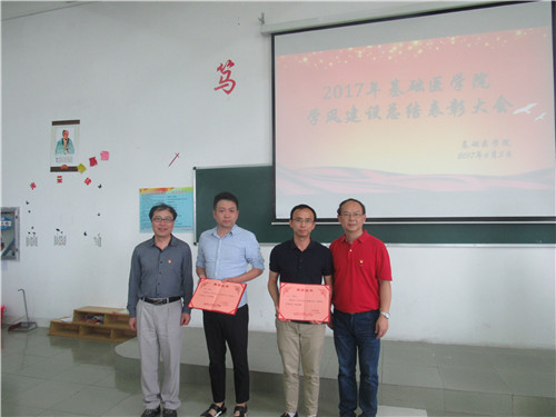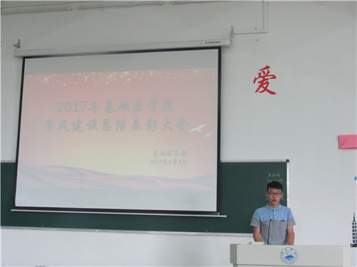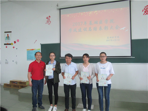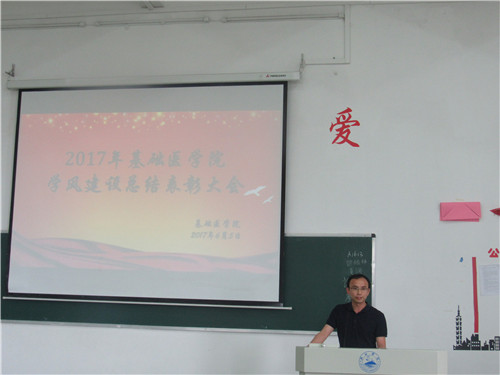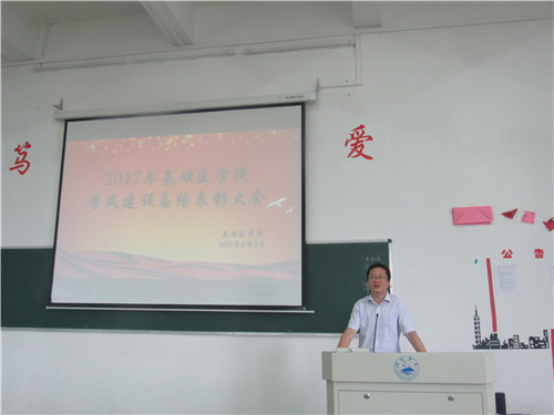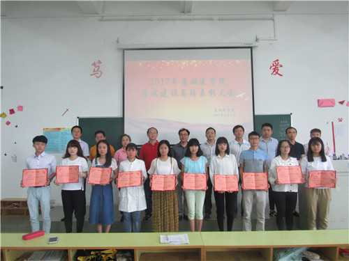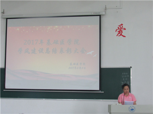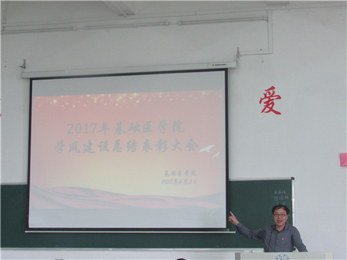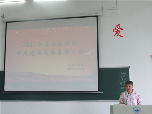 6月5日下午,基础医学院于华阶二召开2017学风建设总结表彰大会,基础医学院院长车向新、党委书记余朝阳、副院长郑美蓉、党委委员傅文学,教务科、团委负责人,辅导员、班主任及受表彰的同学等参加表彰会,此次大会由学生科科长何翠媛主持。