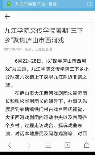 继庐山市电视台及新浪网江西资讯头版报道后,7月4日,江西信息港与焦点信息网再次发布了文传学院暑期“三下乡”聚焦庐山市西河戏活动信息。