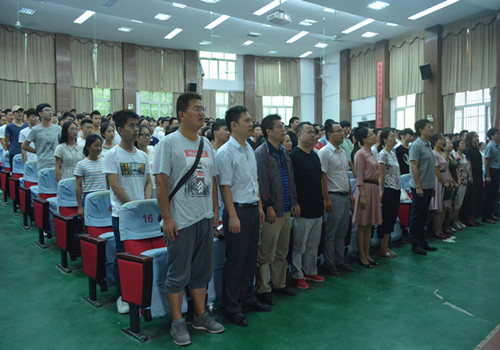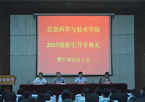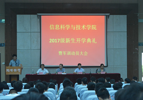 9月7日上午,信息学院在文友楼报告厅召开2017级新生开学典礼暨军训动员大会。信息学院院长邓安远,党委书记袁宜如,副院长邓长寿、胡慧出席会议,各科室负责人、辅导员、班主任和全体2017级新生参加会议。会议由副院长邓长寿主持。大会在雄壮激昂的国歌声中拉开帷幕。