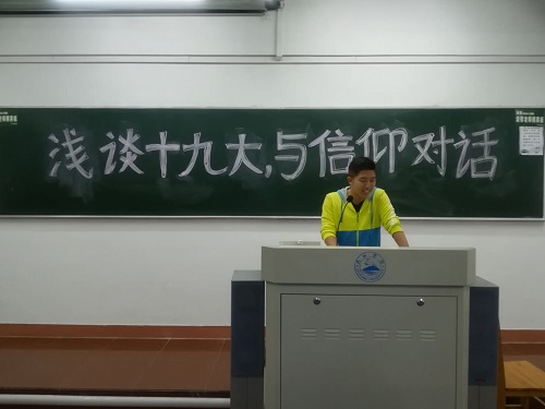 活动中,各班团支书就活动主题简短地谈了谈自己对十九大的认识与理解,打开了自己的心扉,向同学们说了自己的信仰,引起了同学们的共鸣。有同学表示,“信仰是一种目标,也是一种态度,人活着都需要有信仰,我们在大学生活中,更应该明确自己的信仰”。活动中,同学们通过观看视频、诵读十九大的有关资料等多种方式进行学习。活动最后,同学们互相交流自己之与十九大的感悟。
