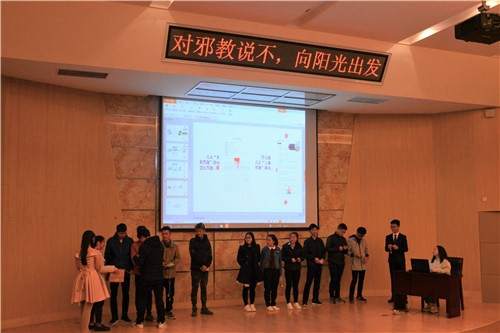 活动伊始,讲解人通过PPT放映从邪教的概念、特征、危害、宣传方式、宗教与邪教区别五个方面为同学们深入剖析了反邪教的原因。宣传活动的过程中还插入了心有灵犀一点通、反邪教知识竞答两个游戏环节,加强了活动的趣味性,调动了同学们的积极性。而后的创意情景剧表演更是以包青天审理邪教案件的新奇剧情吸引了大家的目光,加深了同学们对邪教危害的认识。