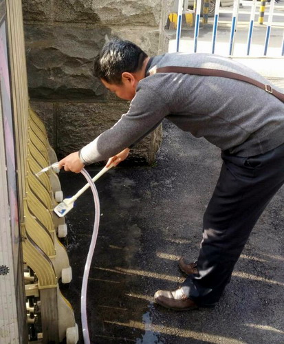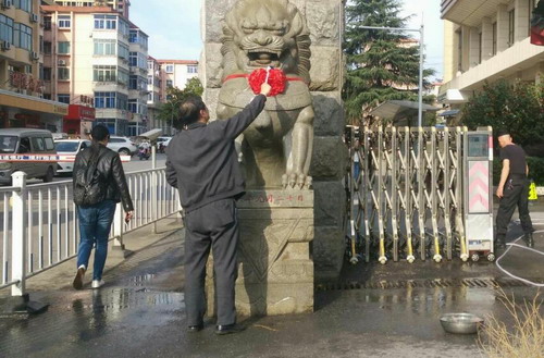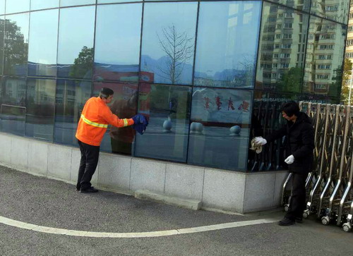 校门是学校的名片。为维护好学校这张名片的形象,彻底打扫校门周边的卫生,保卫处做足了准备。在对周边地面垃圾进行打扫的同时,买了刷子、水管等工具,对门前的石狮、大门的花岗岩及地面上的尘垢进行了清刷冲洗,并将门卫周边的玻璃墙面擦拭一新。