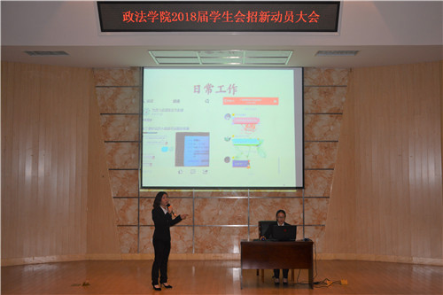 学生会主席黄睿向新生们介绍了学生会的总体工作,结合自身经历给同学们提供了宝贵建议。随后,各部门部长通过PPT和视频播放等形式,图文并茂地展示了各部门的性质特点,加深新生们对学生会机制和部门的了解,并向全体新生发出加入学生会大家庭这一诚挚邀请。