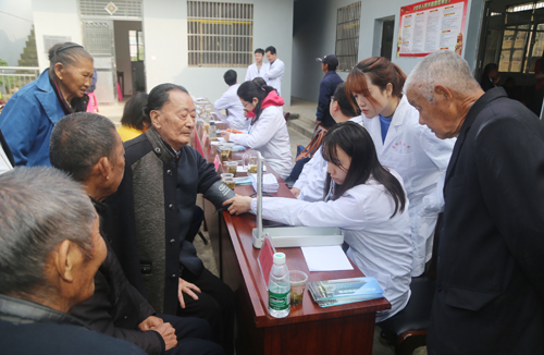 张书记、殷副院长此行安排了由附属医院多位主任医师组成的专家义诊团,并随队携带了心电图、彩超、血压计、血糖仪等诊疗设备为扶贫点村民进行义诊。此次“脱贫攻坚我先行”义诊活动虽然把地点设在我院扶贫点枫树村,但涌泉乡大范围地区的许多居民早就闻讯前往咨询就诊,义诊现场人山人海。殷副院长作为附院神经内科学科带头人、脑血管病知名专家,更是直接“披褂上阵”为村民解决凝难病症。此次义诊共接诊患者约500人,免费发放药品价值2000多元,受到了乡民一致好评。