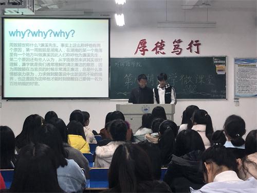 12月2日晚,外国语学院在香远楼各教室开展第116期国学微课堂。本次国学微课堂的主题是“周敦颐”。