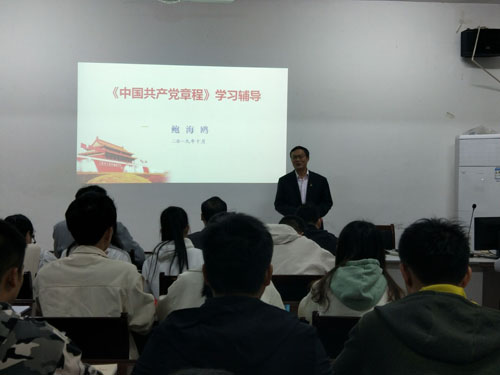 2019年10月15日晚上7点,药生学院于心远楼209会议室开展“不忘初心、牢记使命”主题教育专题党课活动,学院党委书记鲍海鸥作了《中国共产党章程》专题辅导,学院党委班子成员和没课的师生党员参加此次党课活动。
