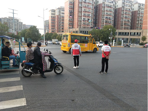 活动开始,志愿者们都准时到达活动地点。他们都统一戴着一顶鲜红的志愿帽,手拿"文明交通劝导"标语,站在道路的入口处,向过往行人进行交通安全常识宣传,劝导机动车及非机动车不要闯红灯,引导行人走斑马线,主动搀扶和帮助行动不便的老人过马路。他们一丝不苟的工作态度、良好的精神面貌和文明素养受到过往行人的高度评价。