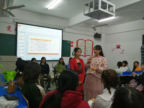 通过前期的宣传与准备,共有12组选手报名参赛。在比赛开始前,主持人用简洁的语言向大家介绍本次比赛的创新性与意义,为比赛的顺利进行打下了良好的开端。接下来,为正式的比赛环节,参赛选手在为搭档上妆的同时伴以口头解说所用化妆品的名称与用途,解答观众的疑惑。与此同时,主持人向观众就各种化妆品的品牌、用途以及口红色号进行有奖提问,观众积极互动,现场氛围十分活跃。比赛尾声,选手们依次向评委及观众介绍自己所化妆容与设计理念,评委根据其作品的创新度、妆面效果以及理念解说等方面进行评分。