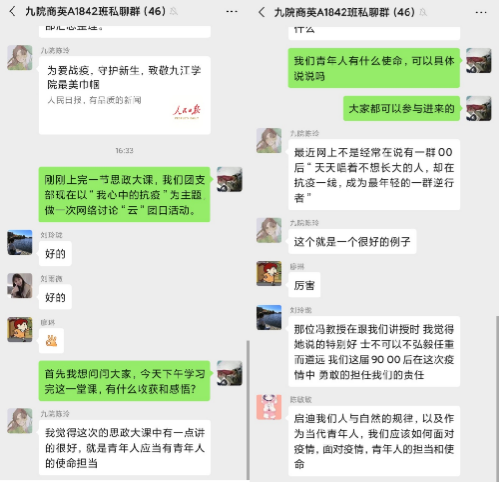 疫情防控思政大课后,团日活动正式开始,各班团支部书记给全体团员讲述了近期疫情的发展和影响,同学们也积极发言,感触颇深。A1933班的同学们以开放的形式,在班级QQ群里畅所欲言,团支部书记带领大家学习抗疫英雄事迹,认识身边最美逆行者。全国各地的无数医生护士主动放弃休假、放弃与家人团圆的机会,请缨前往一线支援武汉,他们为了千千万万家庭的安康,为了确保病患及时的收治,逆流而上,不是朝着家的灯光,而是背对着家的方向;不是前往年味十足的年夜饭,而是奔向急救室的病榻。一封封按满红手印的请缨书,一句句铿锵有力的话语,表明他们一致的信念——不计报酬,不论生死。在肆虐的疫情面前,这些冲锋在最前线的白衣战士是真正的英雄,他们的事迹令人感动。