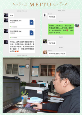 防疫期间,有不少师生需要提供这样那样的证明材料,仲维春同志坚持服务师生的理念,本着尽量减少师生出行的风险,在自己做好防护的前提条件下,都是自己前往学校帮助师生解决问题。2019届毕业生钟圆同学因为出国留学,需要办理毕业证明的相关材料,但由于学校要求材料的不确定性,仲维春老师多次跑到学校给她办理,并再三叮嘱她不要来学校,有什么事他帮忙办。教师异地返校需要证明,他也是开好发扫描件给他们。他说我一个人做好防护多跑点,你们就少一份风险,疫情就早一点过去。同时,他还积极联系校友为学院筹集消毒防疫物资,市场营销专业B0434班的陈学亮校友就为学校捐赠了600支消毒液。