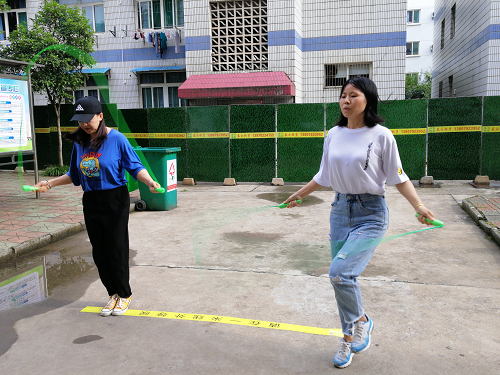 在学生组中,首先开始跳绳项目,选手们个个精神抖擞、卯足了劲。有的轻如飞燕,场地上绳影闪闪,上下翻飞的绳子像金蛇狂舞;有的花样百出,忽而双腿跳,忽而交叉跳,现场的气氛一下子就活跃欢快起来。在呼啦圈项目赛中,更有同学胸有成竹,稳操胜券,从项目开始转到了比赛结束,轻轻松松拿下第一名。