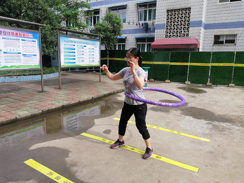 比赛项目按跳绳、踢毽子、转呼啦圈特定的顺序依次进行,其中评分规则:跳绳计跳30秒的个数;踢毽子取三次机会最多次的个数;呼啦圈比转呼啦圈时长。比赛分教工组和学生组两个组别,都以单人项进行比赛。微运会开始,教工组率先进行单人项目的比拼,只见辅导员们肢体灵活,动作敏捷,跳绳、踢毽子、转呼啦圈样样不在话下,赢得观众的阵阵欢呼。