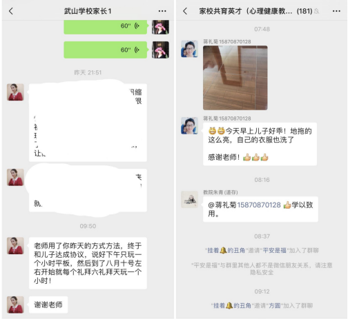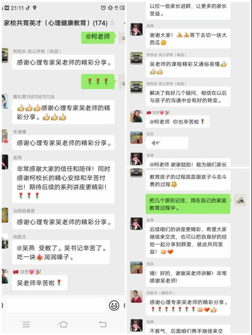 家长朋友们听完讲座后纷纷表示受益匪浅,并将吴燕讲解的方法运用到育儿教育中,取得了立竿见影的良好效果。武山学校的柯校长说:“吴老师的课程精彩又通俗易懂。今天的家庭教育分享十分的精彩,我们会把课程打包,然后发送到各个年级家长群,让更多的家长受益”。九江学院的一位博士家长说:“这样的讲座很好,非常有意义!教师教育学院师生真正发挥了学有所长,服务社会,服务人民群众,这样的活动坚持做下去功德无量。”