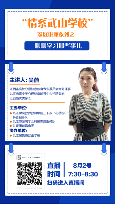 首场讲座由江西省高校心理教育专业委员会常务理事、九江市青少年心理健康辅导中心特聘专家、我校教师教育学院党委副书记吴燕主讲。教工党支部书记、“三下乡”带队教师朱青老师、学前教育教研室主任刘丹青老师、心理学教研室肖胜文老师以及170多位家长朋友在线参与活动。讲座由武山学校柯锦爱副校长主持。